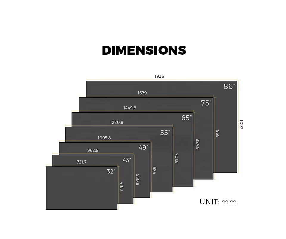 - Screen Size (Inch): 32”, 43”, 49”, 55”, 65”, 75”, 86”, 98”