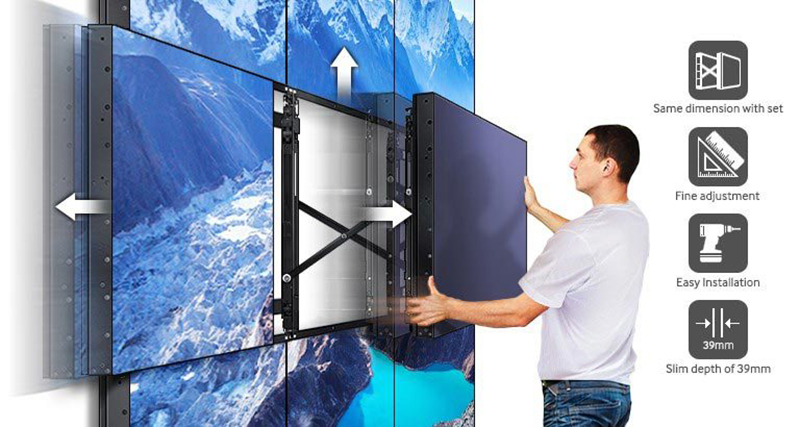 Το Video Wall της σειράς UDE-B της Samsung είναι εξοπλισμένο με μια σειρά φιλικών προς το χρήστη λειτουργιών, ώστε να εξασφαλίζεται μια απρόσκοπτη εγκατάσταση, συμπληρωματική των συγκεκριμένων επιχειρησιακών αναγκών σου. Οι χρήστες μπορούν να εγκαταστήσουν απλά τη βάση και να χωρέσουν το Video Wall στον τοίχο χωρίς να αφιερώσουν χρόνο για να μετρήσουν τη διάσταση της τοποθέτησης σε τοίχο και να υπολογίσουν το κενό. Οι οθόνες έρχομαι με ένα κορυφαίο mount για εύκολη εγκατάσταση και βαθμονόμηση για να συγκρατεί κάθε οθόνη στη θέση της χωρίς να αποσπάται η προσοχή των θεατών.